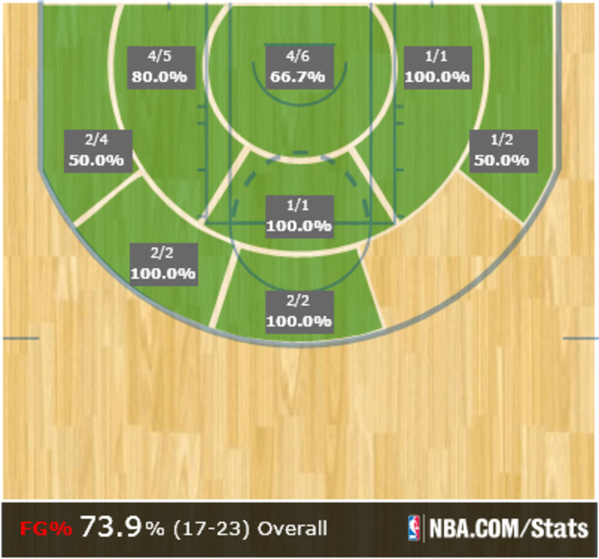 Davis thrives in this in-between game, though on Monday he also found a rhythm at deeper range. Opponents can only do so much to prevent Davis from getting to the rim as it is. But when he’s also connecting on jumpers at a near-flawless rate, the task of containing Davis, who’s already taller and more athletic than those generally asked to guard him, becomes all the more futile. Just look at his shot chart, courtesy of NBA.com: