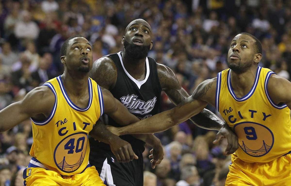 Harrison Barnes, left, and Andre Iguodala box out Sacramento Kings forward Quincy Acy.