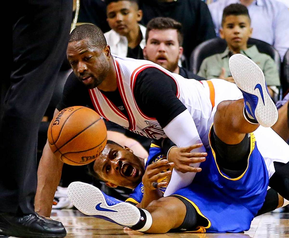 Leandro Barbosa and Dwyane Wade get tangled up on a night in which Steph Curry would hit the go-ahead three-pointer with 38 seconds remaining to help lift Golden State over Miami.