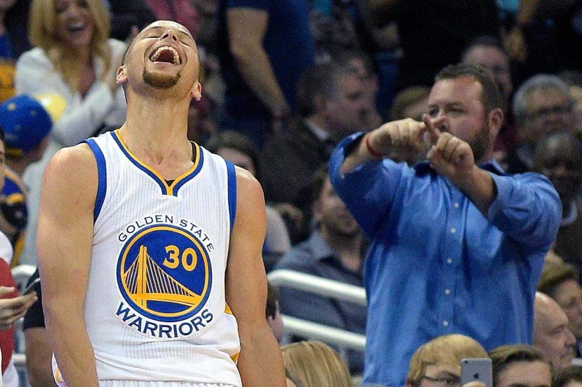 Much to the chagrin of at least one Orlando fan, Steph Curry celebrates after making a three-pointer from near the half-court line at the end of the third quarter. Curry made 10 threes and scored 51 points on a night when he set yet another NBA record—128 consecutive games with a 3-pointer made.
