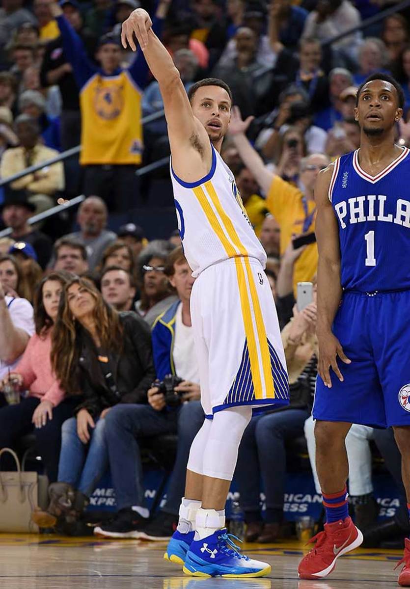 Stephen Curry watches one of his three-point attempts while Ish Smith of the Philadelphia 76ers looks too. The night belonged to Klay Thompson, who scored 40 points in consecutive games for the first time in his career.