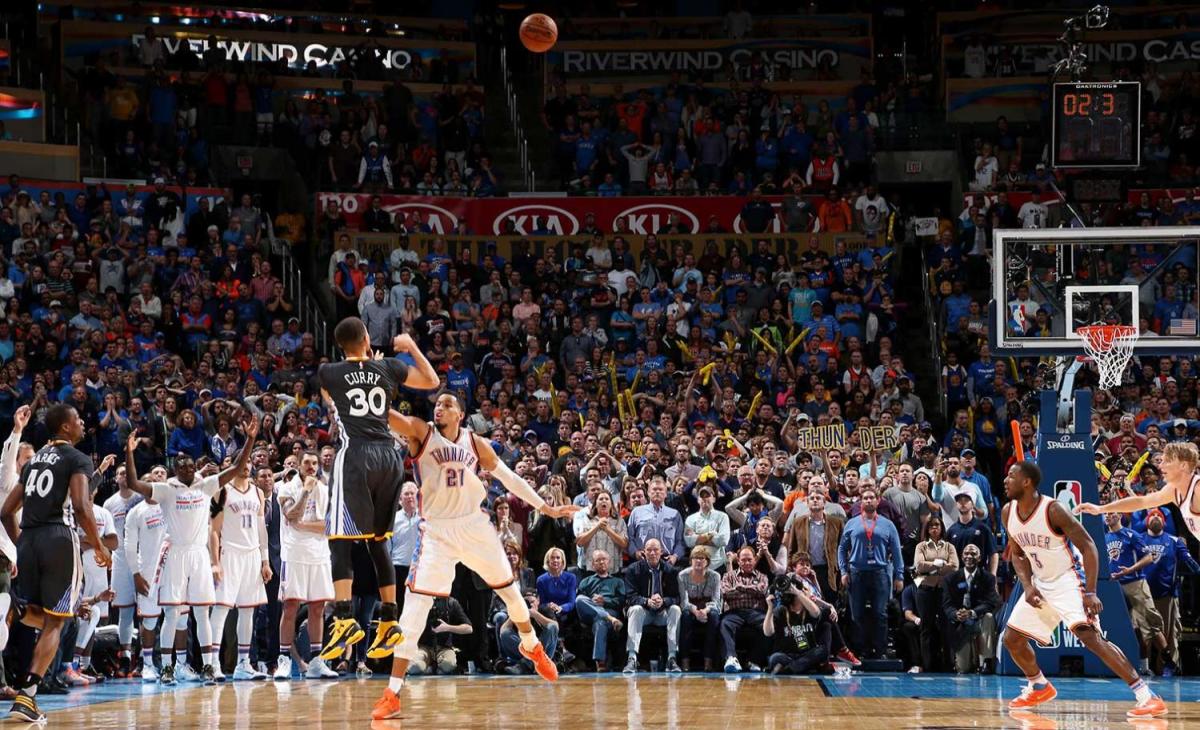 Steph Curry hit this long-range three (his 12th of the game) to lift Golden State to a thrilling overtime win over the Thunder.