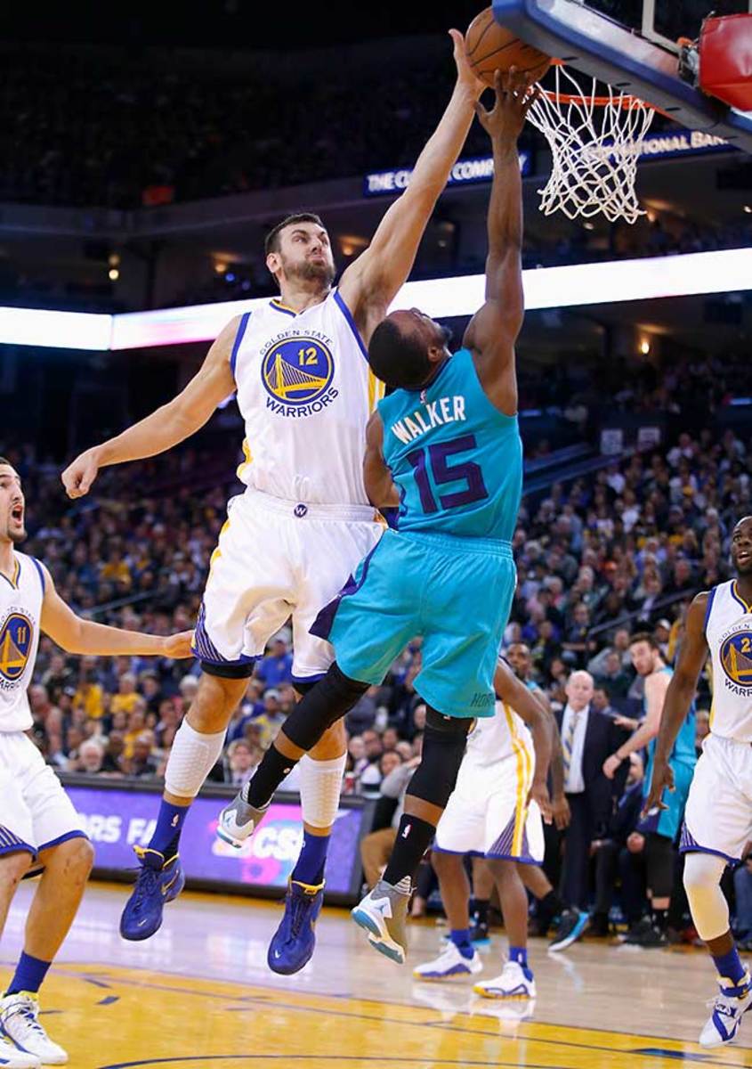 Andrew Bogut blocks Kemba Walker in a game in which Draymond Green became the second player in Warriors history to have three straight triple doubles.