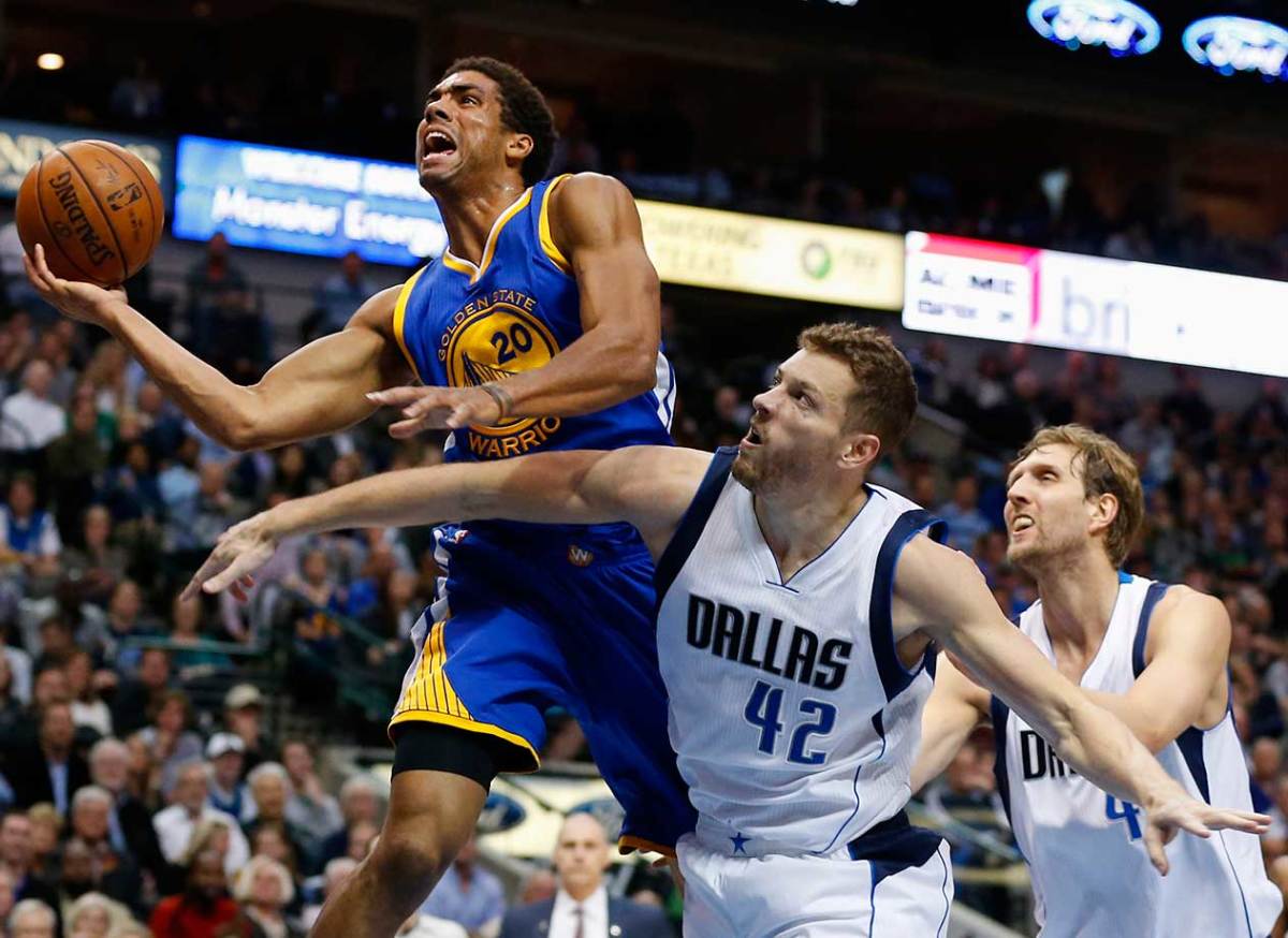 James Michael McAdoo drives past David Lee (42) of the Dallas Mavericks in a game in which Steph Curry and Klay Thompson combined for 70 points.