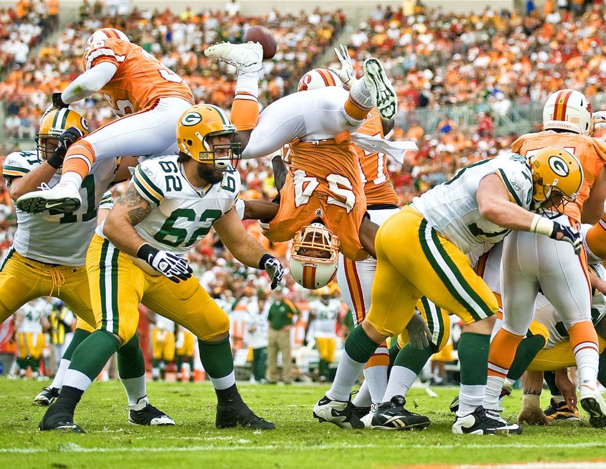 Buccaneers linebacker Geno Hayes got upended during a field goal attempt by the Packers.