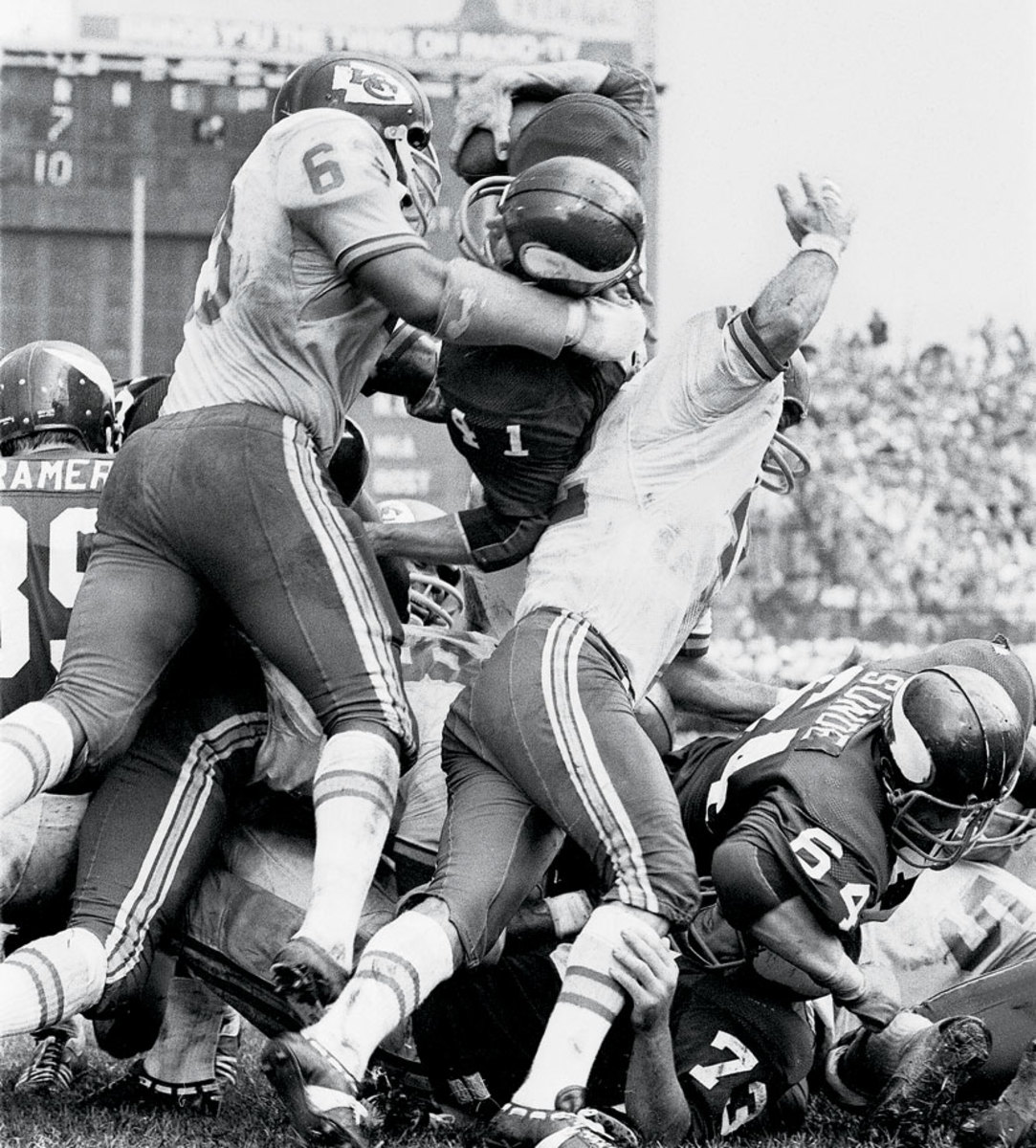 Eight months after Super Bowl IV, Dave Osborn and the Vikings avenged their loss to Willie Lanier (63) and the Chiefs.