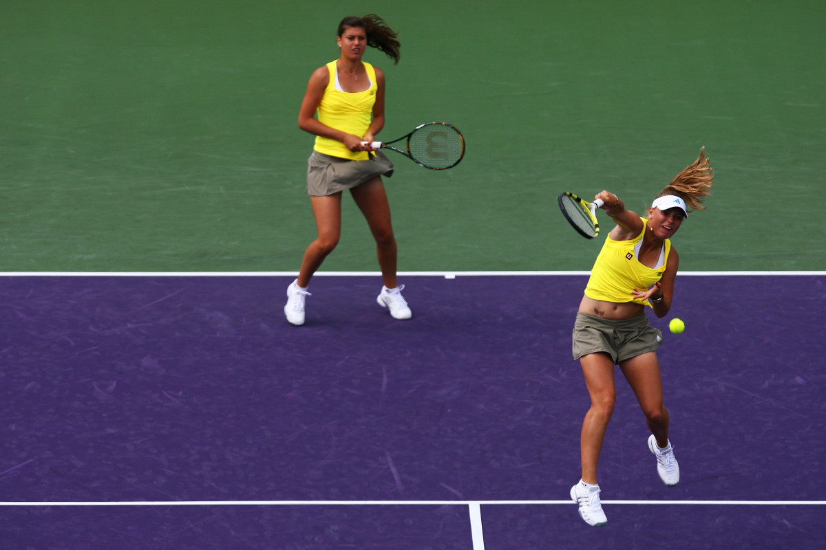 Matching neon safari kits for Wozniacki and her doubles partner Sorana Cirstea. Wozniacki played doubles?