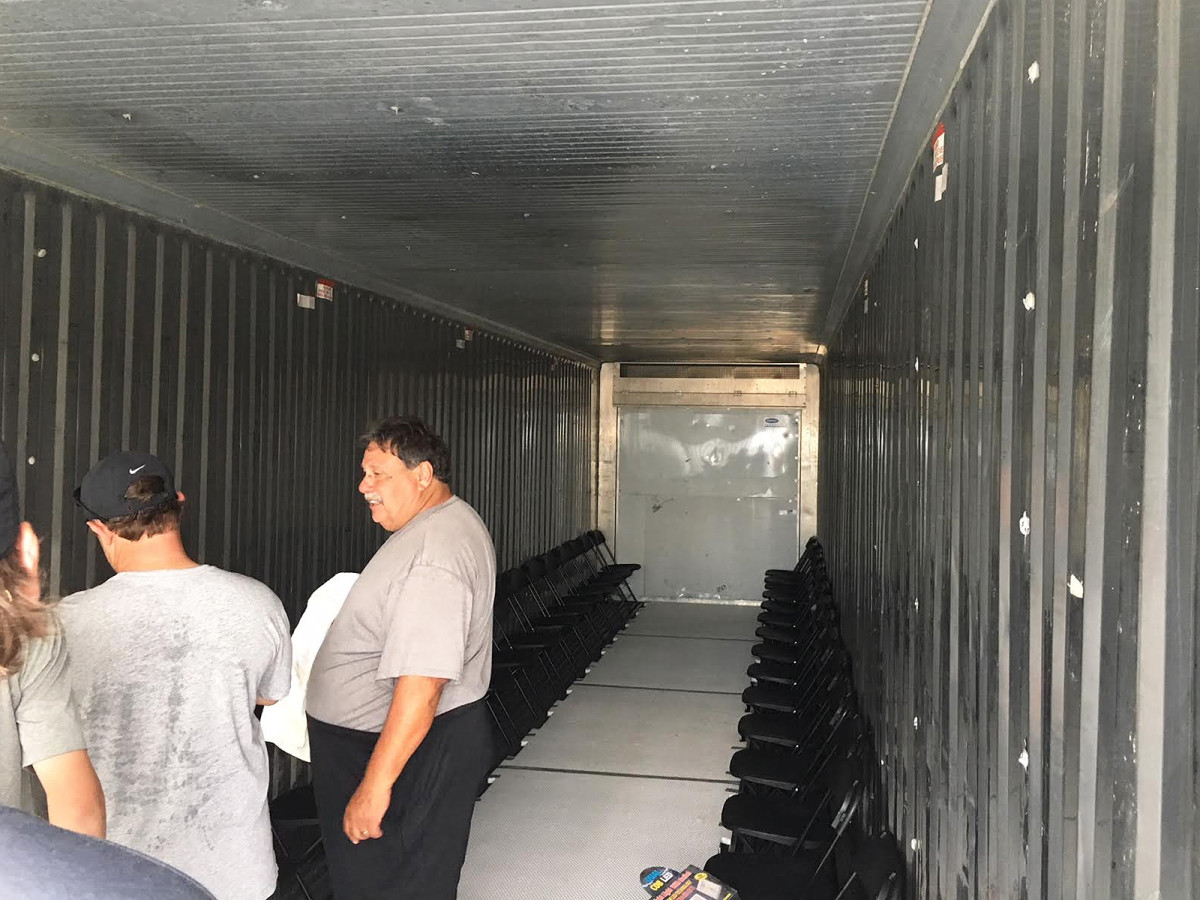 This 40-foot-long shipping container has carried and kept cool bananas from Peru, lettuce from Mexico and pineapples from Hawaii, riding the high seas on a cargo ship or bustling across the freeway on an 18-wheeler. It now sits on LSU’s practice field, and LED lights inside illuminate the transformation from a produce-carrying giant box to a new-fangled cooling center: 45 folding chairs are lined up alongside the aluminum walls, and between them a walking path of thick Styrofoam runs down the center, from the container’s large swinging doors to the cooling unit pumping air so frigid that temperatures can reach 22 degrees.