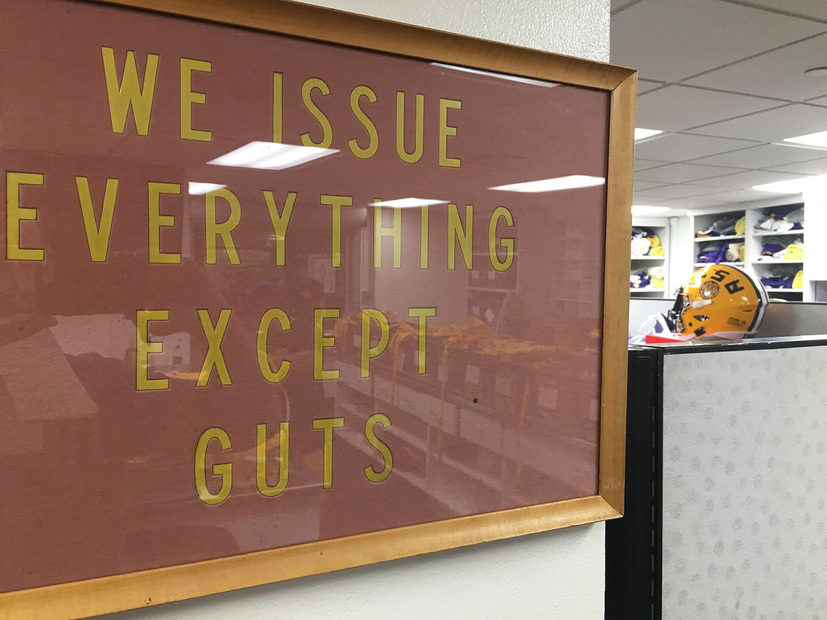 These are the unsung heroes of any football program, guys who are paid little or nothing at all, fathers who spend long hours at football stadiums and in locker rooms tending to some of the country’s biggest stars. Their bond with players is like no other. LSU has two equipment rooms, one at Tiger Stadium and another at the football operations building, and they each feature a glassless window opening up to a locker room. “We see them every day. We get close to them,” says 32-year-old Matt Montgomery, one of Stringfellow’s full-timers. “We can look at them and tell if they’re in a bad mood or if something’s wrong.”