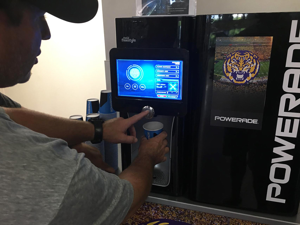 Sodium-enriched Powerade is a big thing around here, too. In fact, the school recently acquired what Hudson Lemoine describes as a “freestyle Coke machine on steroids,” except it discharges Powerade. It is believed to be the first of its kind in America, and it was recently used at the World Cup in Russia, he says. The machine creates singular custom cups of Powerade, with settings that can be adjusted on a digital touchscreen. An athlete can choose his cup’s flavor and sweetness while also controlling its amount of carbohydrates, sodium, potassium and electrolytes.