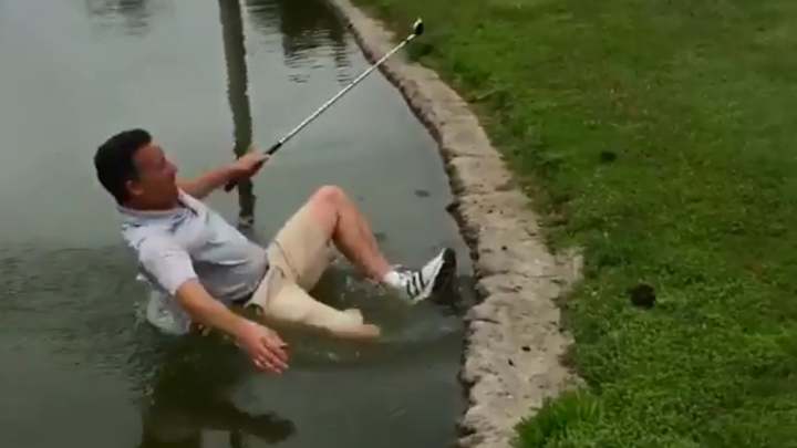 Former NHL player Teemu Selanne’s golf round just got so much better when one of his friends fell into a pond while trying to hit the ball.