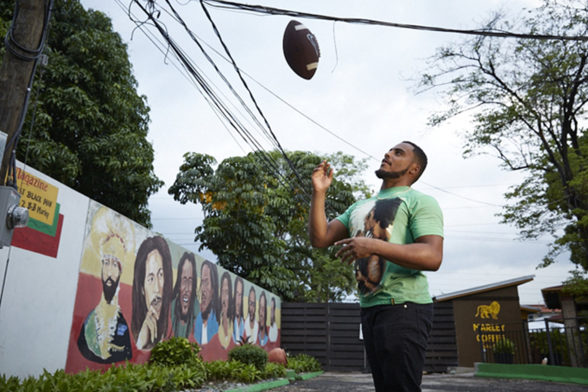 Tulane linebacker Nico Marley, grandson of Bob Marley, tosses a football during an SI photo shoot at the Bob Marley Museum in Kingston, Jamaica, on May 16, 2014.