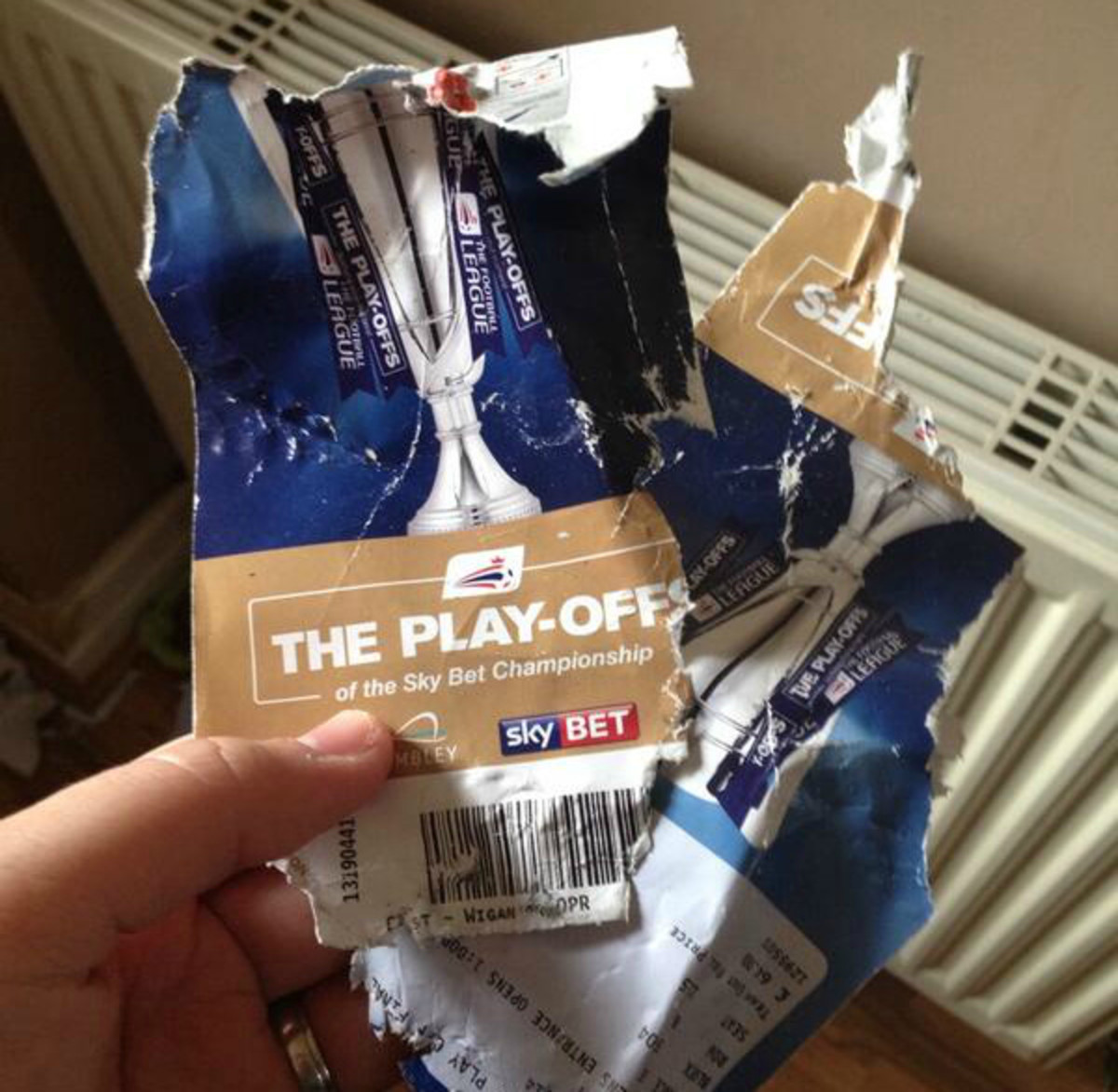 A Queens Park Rangers fan got an unwelcome surprise when he returned home to discover that his tickets to the team's must-win playoff against Derby County had been chewed to bits with the rest of his mail by his dog.