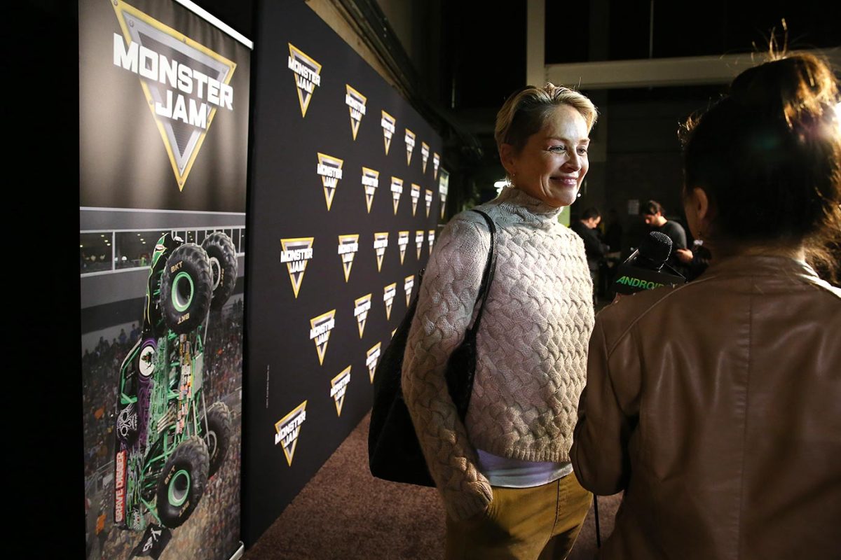 Actress Sharon Stone talks with tv reporters after arriving at Monster Jam with her young sons. Stone was one of many celebrities at the event.