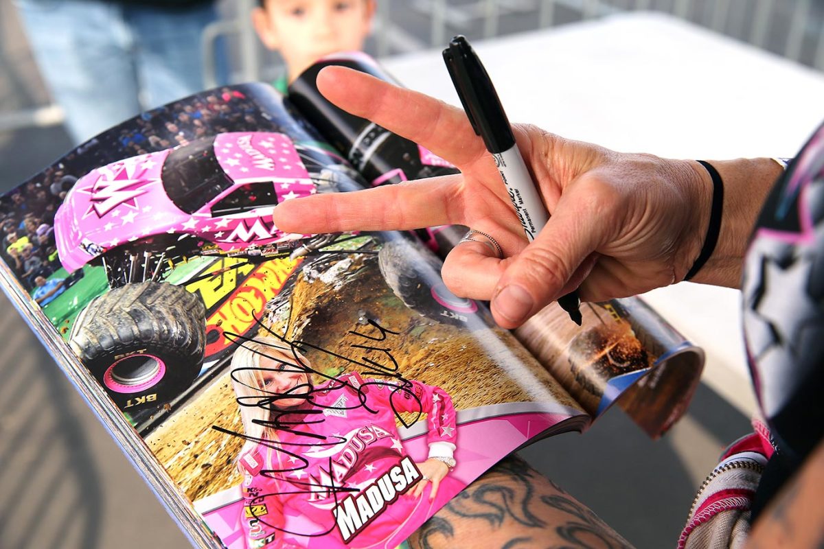 Madusa signs an autograph in the Monster Jam program for a fan before the competition.