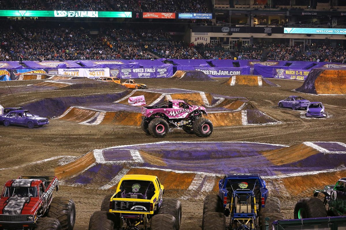 A fan favorite, Monster Truck 'Madusa' roars into the stadium to the cheers of the crowd.