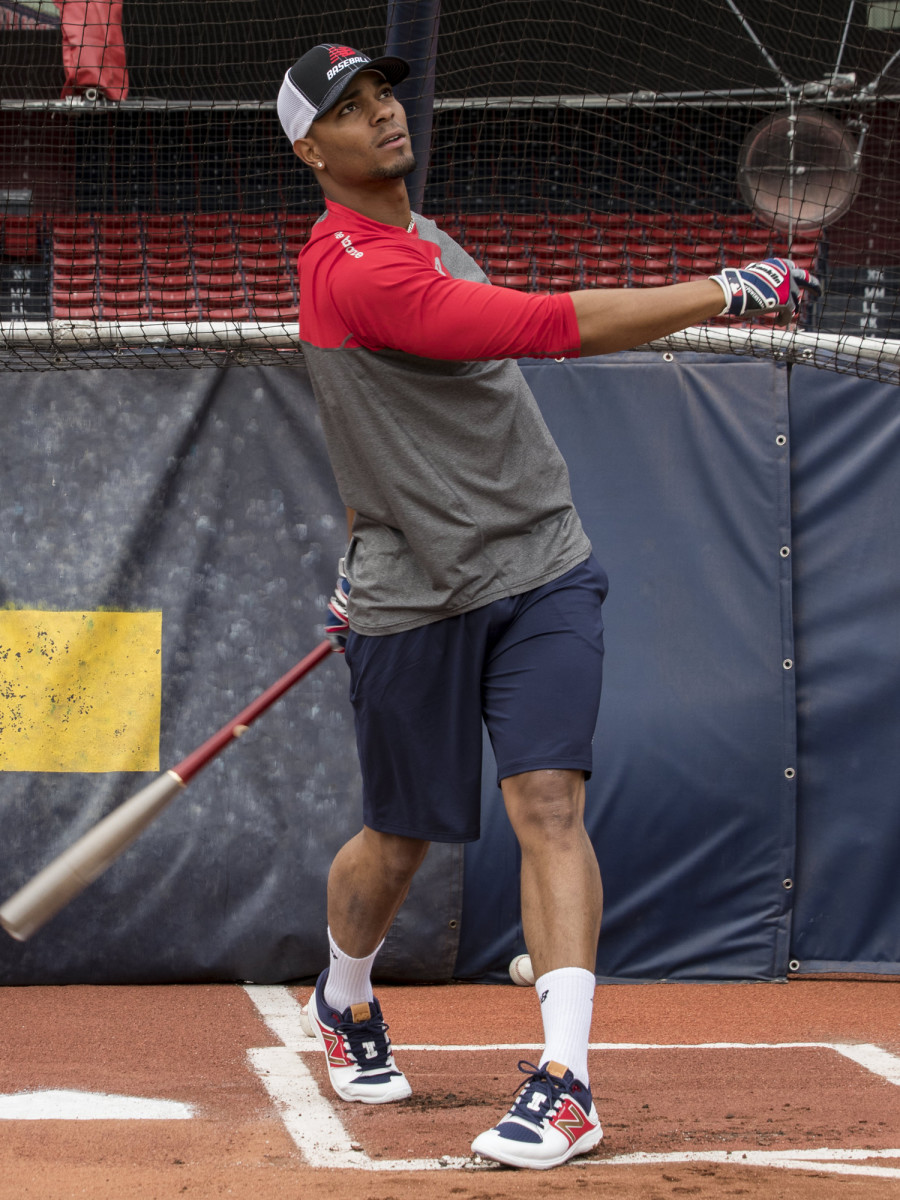 To kick off customization of the new cleat, New Balance created a variety of choices for Cano and Bogaerts as examples of the billions of color combinations on a cleat known for a comfort collar and cushioning. “Xander does not have a custom, so he is super pumped,” Grondin says. “Xander almost felt like a little kid. The Red Sox having red and blue in the shoe makes multiple colors much more fun to do. The shoe he wore at launch, no one is wearing those color combinations.”