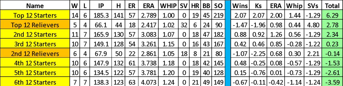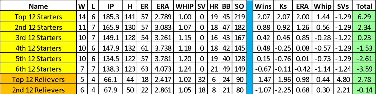 By looking at the highlighted yellow line, a fantasy manager can see the baseline of an ace. Last year, a pitcher needed 14 wins with a 2.79 ERA, 1.000 WHIP, and 219 strikeouts to be considered an ace.