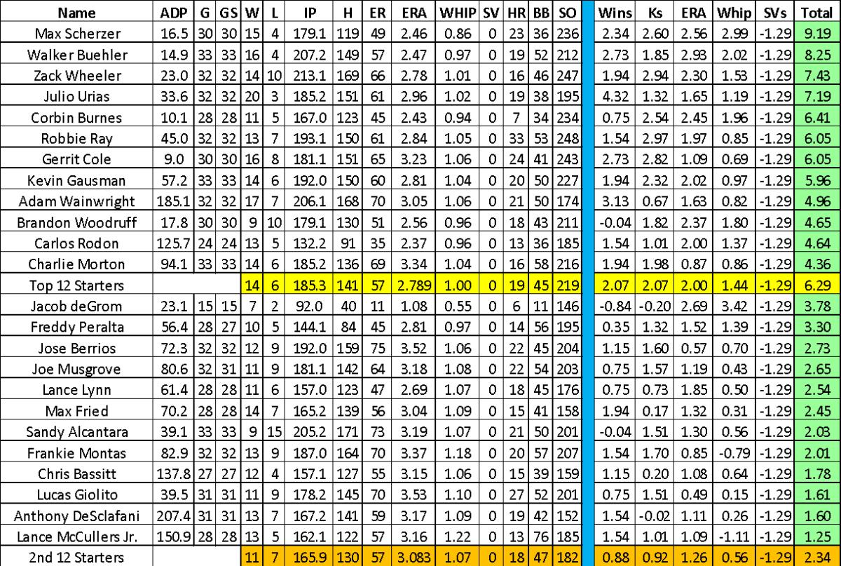 Fantasy managers can see the edge created by drafting an ace starting pitcher based on the above grid of pitchers. Each year, the starting pitching pool will change, forcing drafters to make different evaluations on who to take in drafts.
