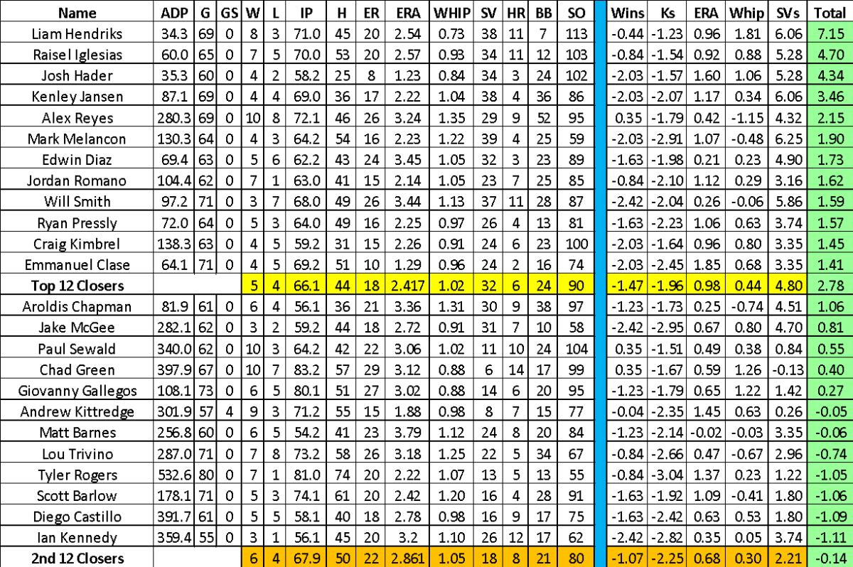 By following this chart, it suggests a top closer is more valuable than a second-tier SP2. On the flip side, a second ace arm with the ability to pitch over 200 innings would be a significant score if he ranks highly in wins, strikeouts, ERA, and WHIP. If starting pitching flies off the board early and the depth looks questionable, a move to an elite closer like Josh Hader or Liam Hendriks does make sense. The next decision comes when to start adding your second closer.