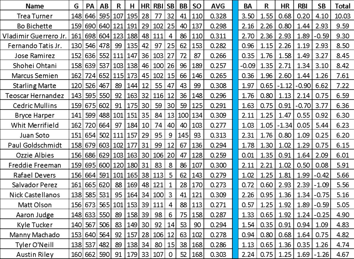 I listed Turner, Guerrero, and Soto as my comparable players as these three players all fit my game plan to build the foundation of my offense. After my first three batters, I want to have a high batting average base with a combination of 75 home runs and 75 steals. By doing this, I can create easier outs in some categories while also adding more flexibility in my decision-making in each draft.