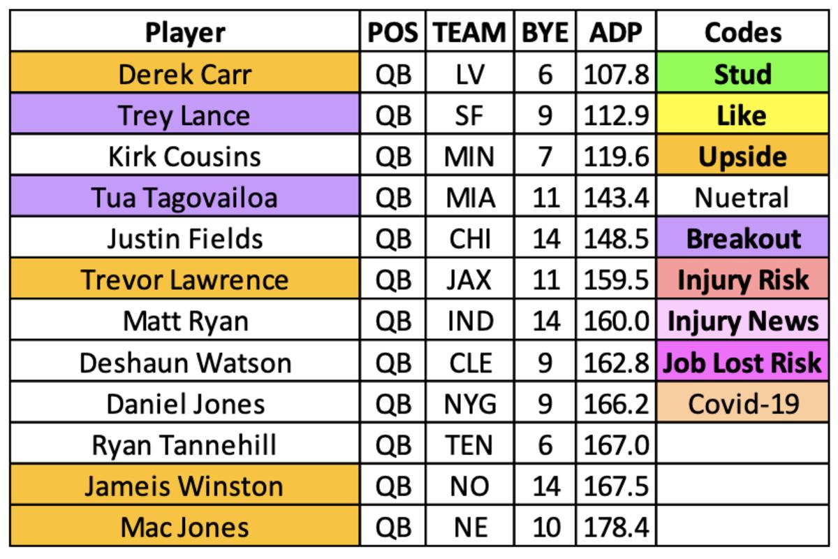 Derek Carr should fall into the breakout category after the Raiders made a change at head coach while adding an elite WR1 (Davante Adams). His completion rate (68.7) has been an area of strength over the last four seasons, and it should only get better with Adams on the roster. In addition, Las Vegas has a top-tier tight end (Darren Waller), and Hunter Renfrow is one of the most challenging receivers to cover over the short areas of the field. The Raiders will successfully run the ball in close, and their overall receiving corps lacks big-play threats. I view Carr as a steady quarterback option, and I could be undervaluing his potential in passing yards and touchdowns.