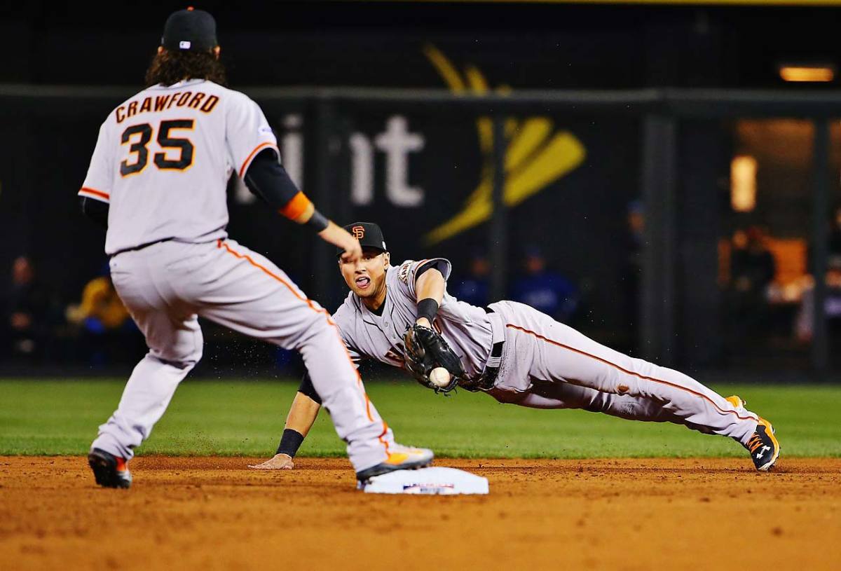 Joe Panik make a superb defensive play with the game tied at 2-2 in the third inning, flipping the ball out of his glove to start a double play.