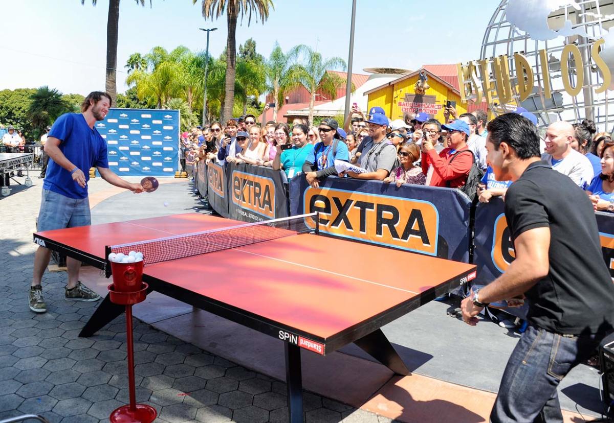 Clayton Kershaw plays ping pong against Mario Lopez on "Extra" at Universal Studios Hollywood on Aug. 20, 2014 in Universal City, Calif.