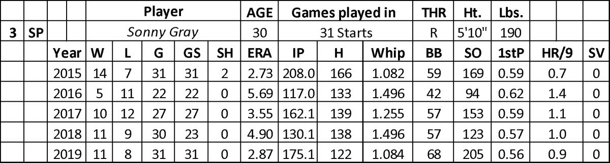 The escape from New York played well for Gray in 2019. He had a massive jump in his strikeout rate (10.5 – 8.5 in 2018 and 8.3 in his career) despite minimal improvement in his walk rate (3.5). Batters only hit .196 against him, which led to his best season since 2015 (2.73 ERA). Gray didn’t have any disaster games (four runs or fewer allowed in all 31 starts) while allowing two runs or less in 20 contests.