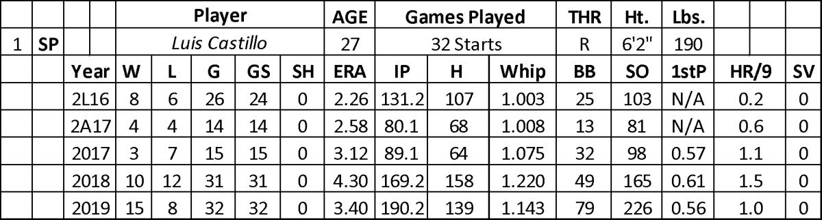 Even with a big push forward in wins (15), ERA (3.40), and strikeouts (226), Castillo left some stats on the table in 2019. His walk rate (3.7) was a disaster when considering his success (2.6) in this area in 2018 with the Reds. He did have a significant spike in his strikeout rate (10.7 – 8.8 in 2018). Over his first 24 starts, Castillo went 11-4 with a 2.69 ERA, .192 BAA, and 172 strikeouts over 143.2 innings. He allowed two runs or fewer in 19 of his starts over this stretch. His fade in ERA came from three disaster games (18 runs and 27 baserunners over 15.1 innings) over his final eight starts (5.55 ERA), but batters only hit .230 against him over his step back in value.