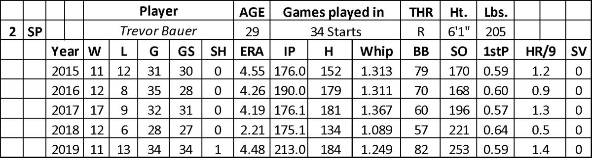 Bauer failed to repeat his growth in walk rate (2.9) in 2019 (3.5) while also serving up 1.4 home runs per nine innings. His ERA (4.48) more than doubled (2.21) from 2018 while remaining tough to hit .230. Over 24 starts with the Indians, he had a 3.79 ERA over 156.2 innings with 185 strikeouts and better success in BAA (.218). Bauer allowed four runs or more in nine of his starts with Cleveland. His arm was up and down with the Reds over ten starts (6.39 ERA) with his four bad days (27 runs and 36 baserunners over 18.1 innings) outweighing his limited shining moments.