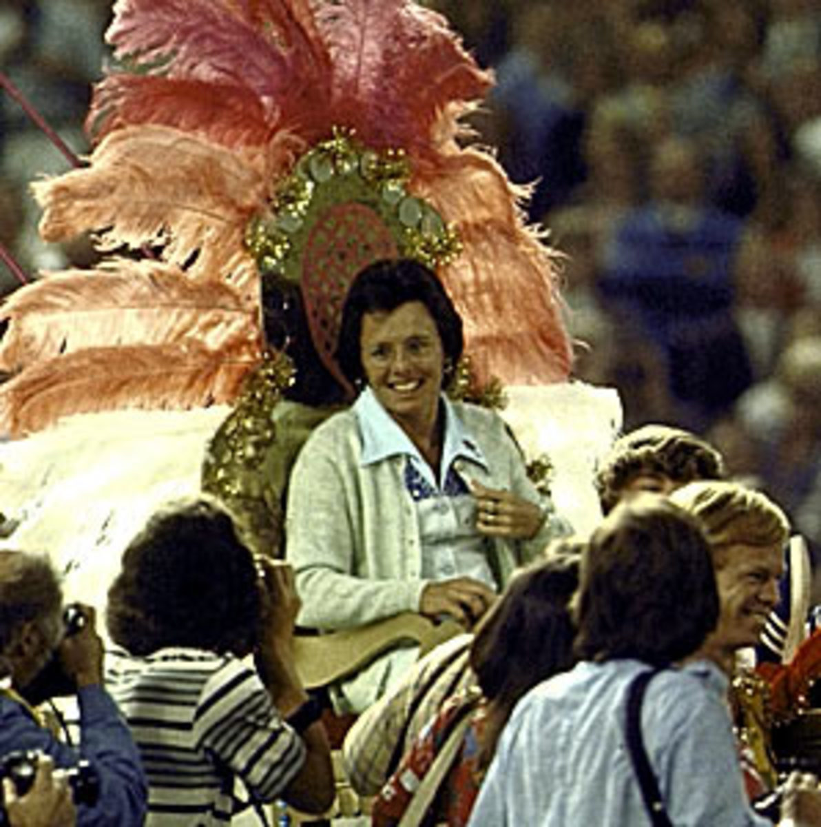 Without hesitation, Billie, wearing blue suede Adidas sneakers and a sequined tennis dress for the occasion, replied, "God, that would be great." And with that nod, Billie entered the Astrodome on the litter as a Cleopatra with a backhand while Bobby was ferried in by babes on a rickshaw.