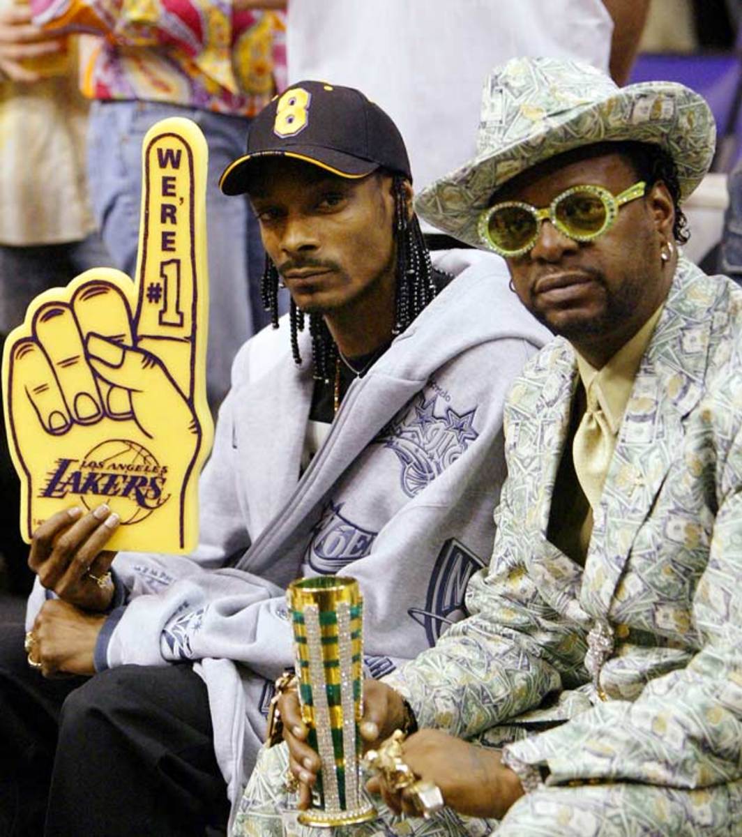 Snoop, a devoted West Coast fan, spreads some Laker love with fellow rapper Don "Magic" Juan.