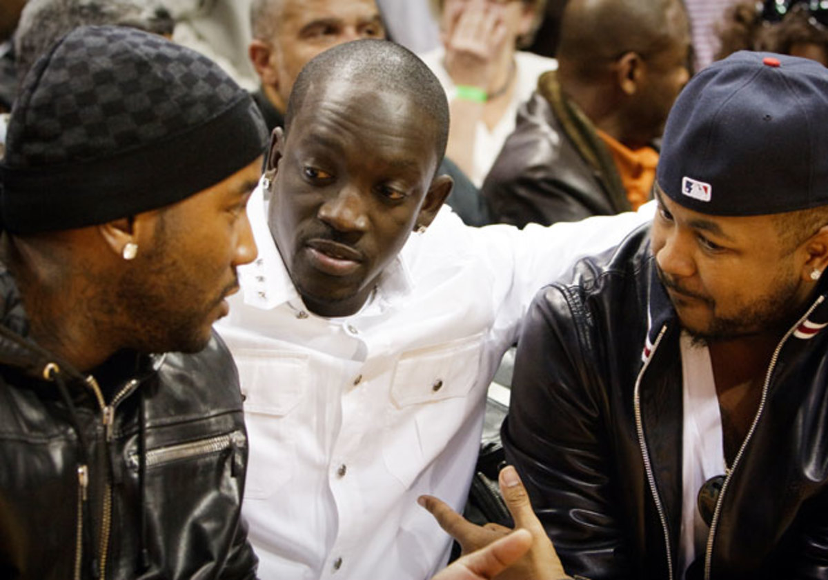 Young Jeezy (left), Akon (middle) and The Dream sit courtside to see their Atlanta Hawks.