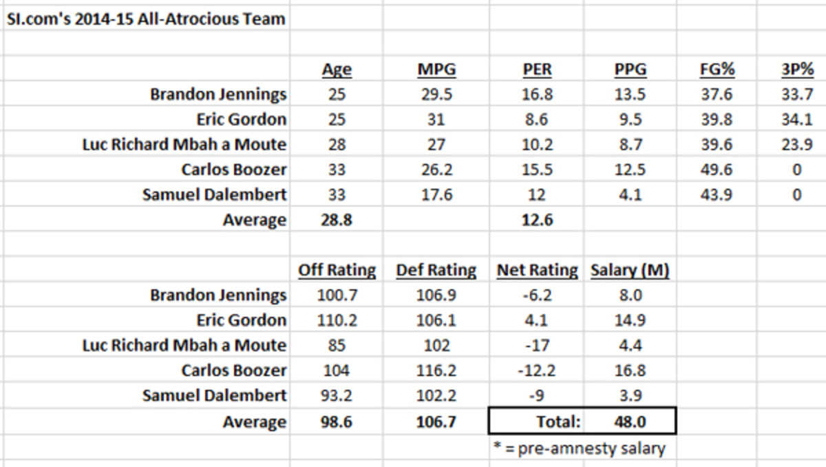 Welcome to the second annual All-Atrocious Team, a twisted exercise that aims to build the worst starting lineup from players who have been starting for their respective NBA teams for a majority of the 2014-15 season.