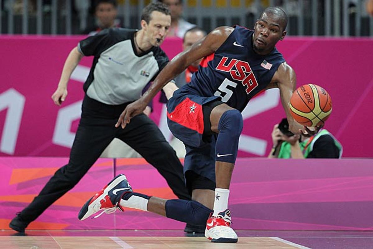 Durant looks to save the ball in a preliminary round Olympic game against Tunisia.