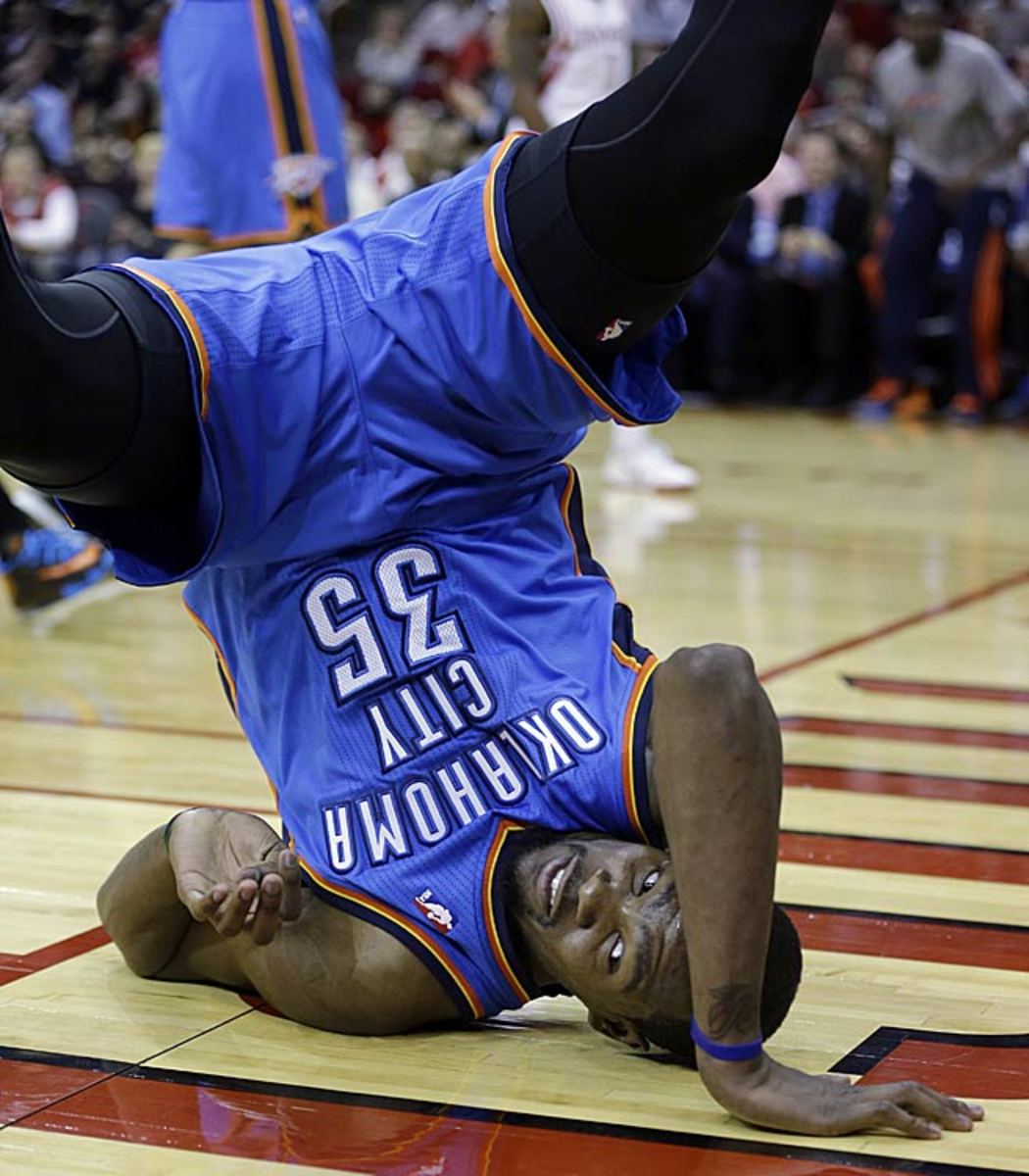 Durant flips on his head after being fouled by Houston Rockets' Aaron Brooks.