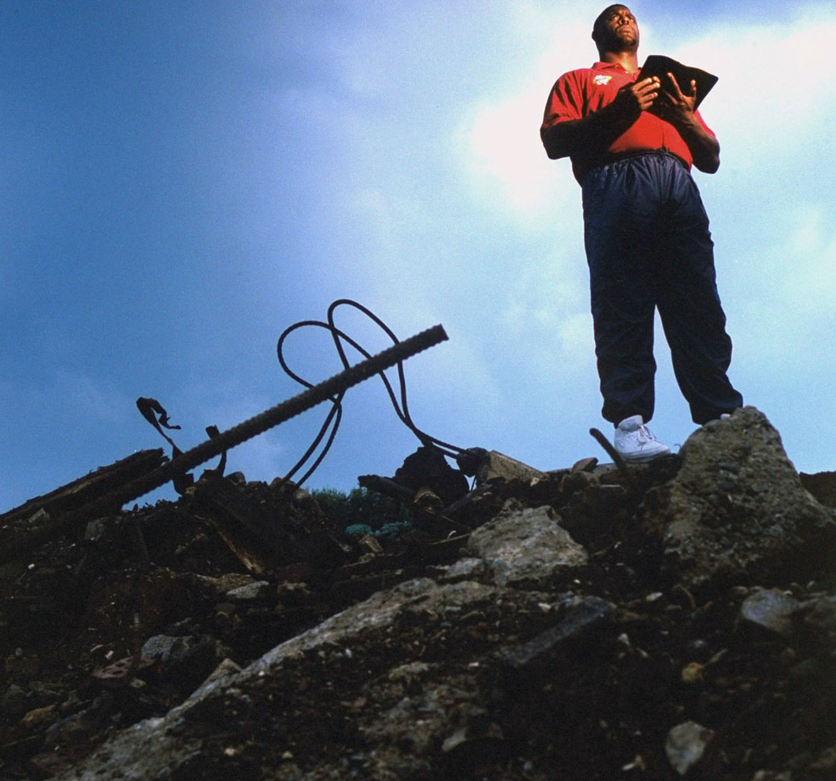 Green Bay Packers DE Reggie White stands on the rubble of his burned down church on June 20, 1996 in Knoxville, Tenn.