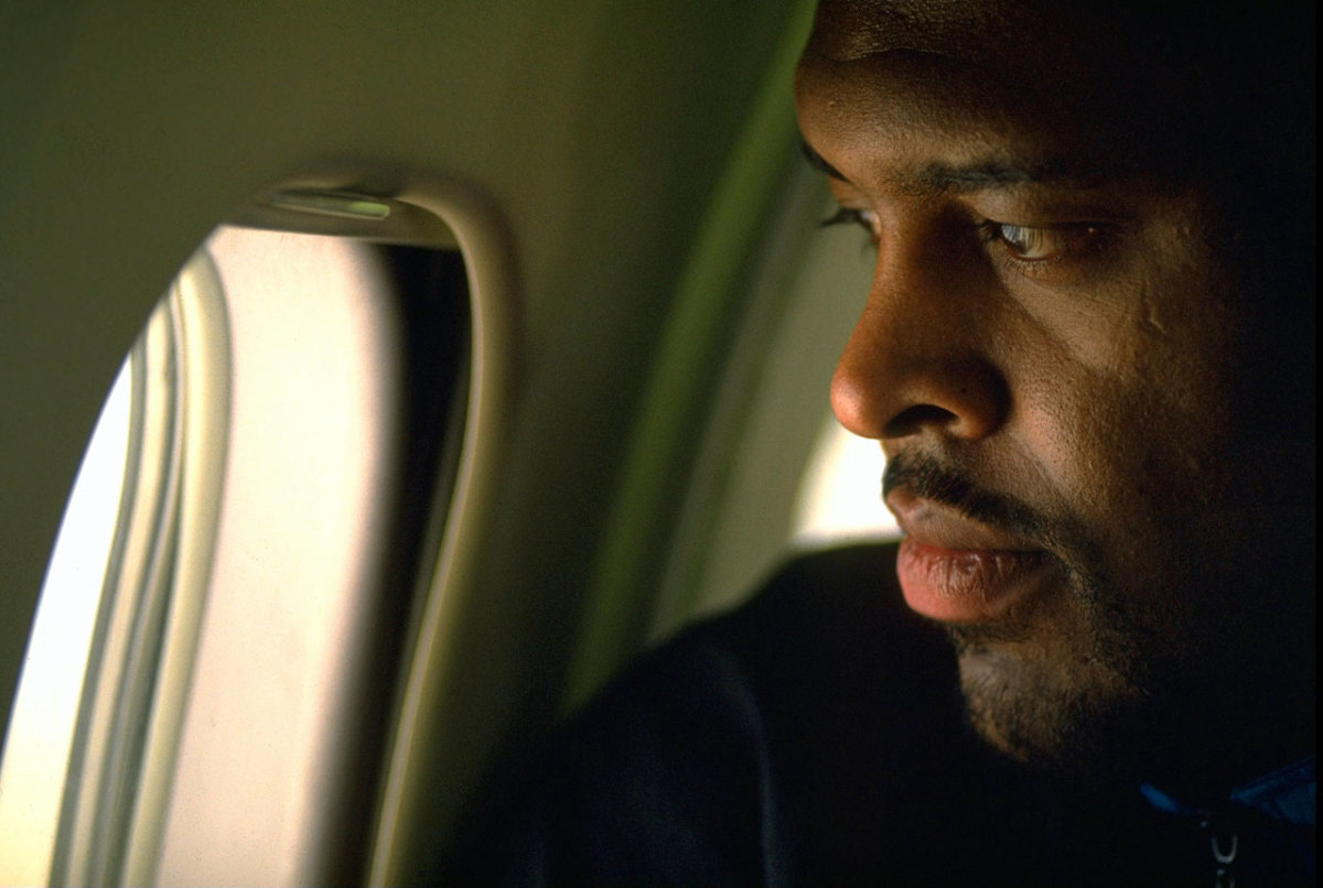 Free agent DE Reggie White looks out an airplane window on March 6, 1993 as he arrives in Cleveland, Ohio.