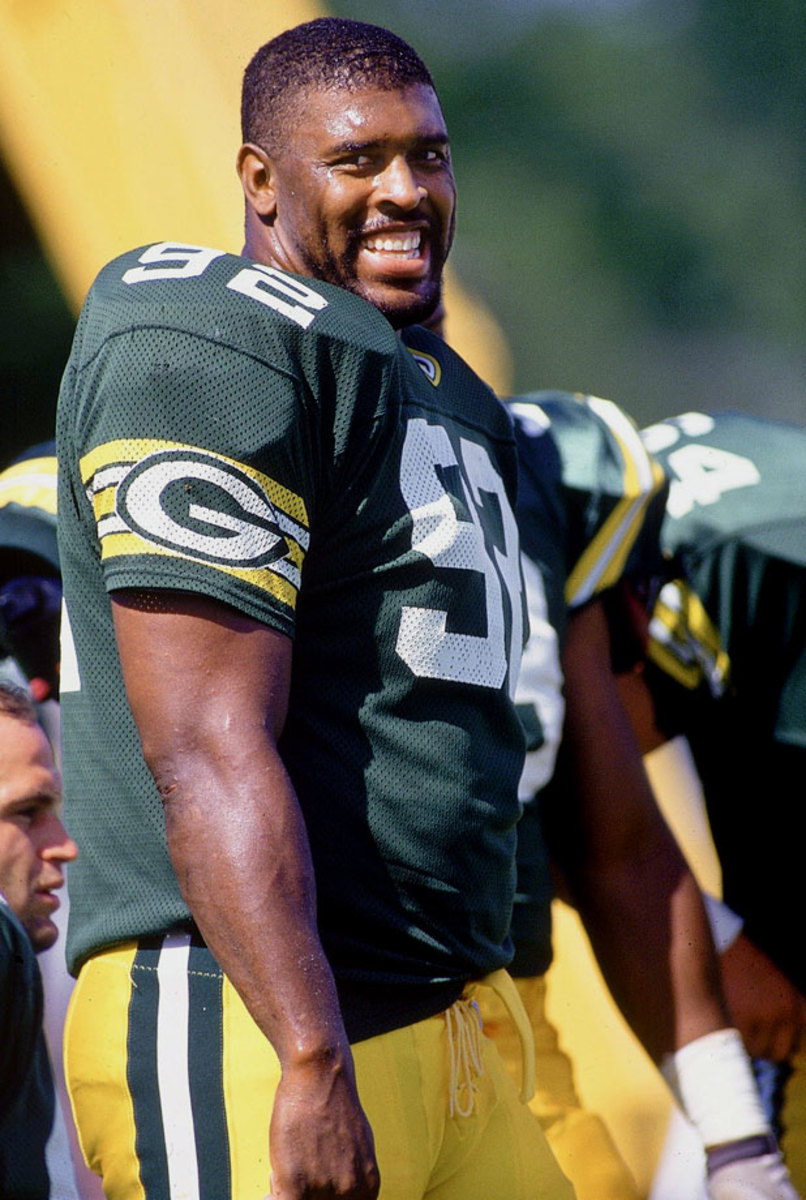 Green Bay Packers DE Reggie White smiles during training camp on July 19, 1993 in Green Bay, Wis.