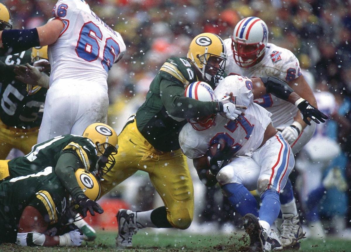 Green Bay Packers DE Reggie White tackles Tennessee Oilers RB Eddie George at Lambeau Field on Dec. 20, 1998 in Green Bay, Wis.