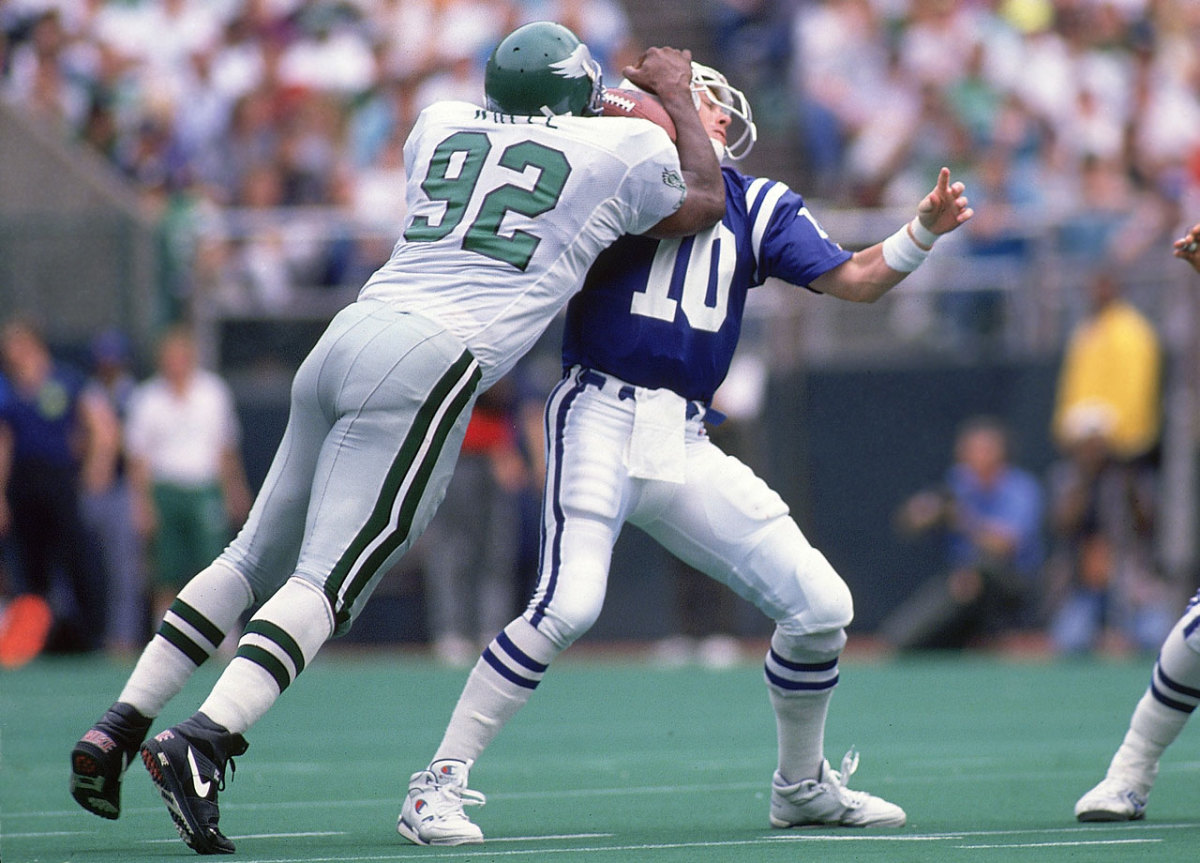 Philadelphia Eagles DE Reggie White sacks Indianapolis Colts QB Jack Trudeau on Sept. 30, 1990 in Philadelphia.