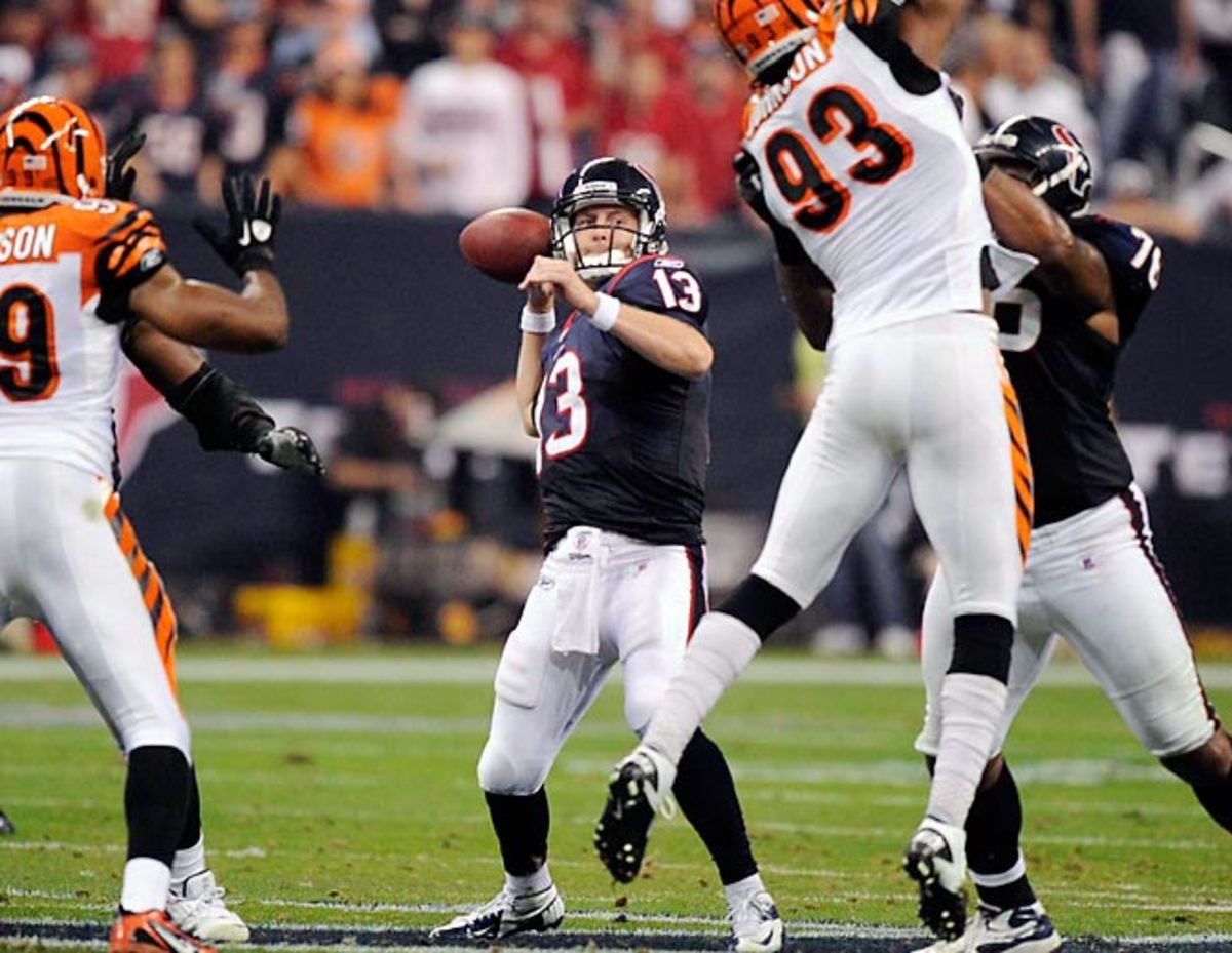 The Texans host the Cincinnati Bengals for the first playoff game in franchise history. After losing starting quarterback Matt Schaub to a foot injury in the 10th game of the season and backup Matt Leinart in the next game, backup T.J. Yates marshaled the Texans offense to end the regular season. The rookie out of North Carolina managed the offense (11-20, 159 yards, one touchdown) while running back Arian Foster starred (24 carries, 153 yards, two touchdowns) in a 31-10 win over the Bengals.