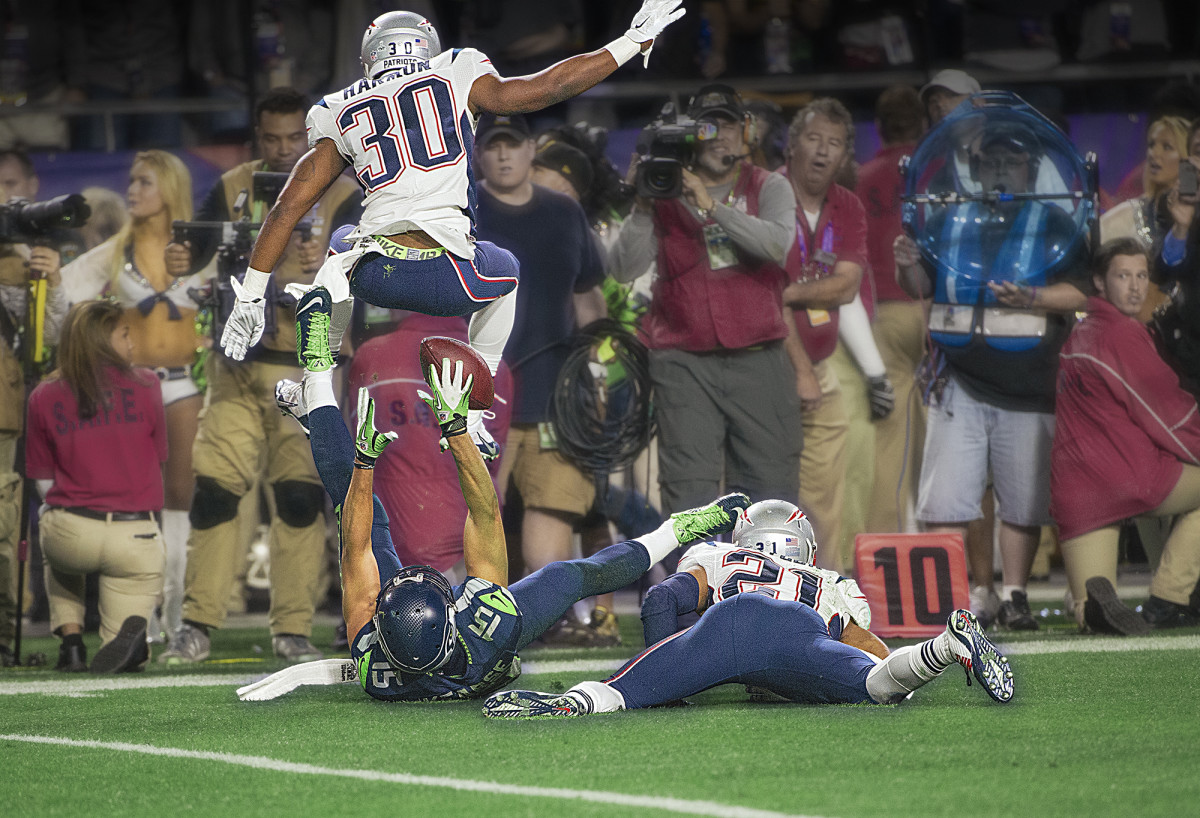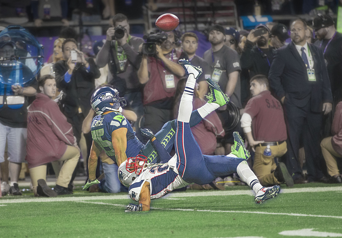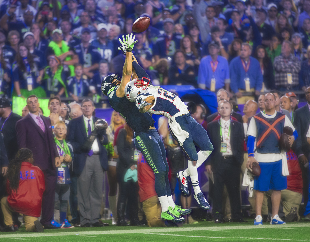 On a first-and-10 at New England’s 38, with 1:14 left, Kearse got what he was expecting: man coverage from Butler, who had followed him that night. He flew up the right sideline on an Inside Go route. “It all happened so fast,” he says. Wilson lofted a high spiral. Short, Kearse thought, as he tracked the flight and slowed down ever so slightly around the 15-yard line. As the ball descended he fell backward, entangled with Butler. Butler deflected it as they fell. “It’s broken up again,” began play-by-play man Al Michaels, who then paused for a beat, “and, is it? . . . But, somehow—did he wind up with the football?!” With Kearse spinning on his backside, legs splayed in the air like a break-dancer, the ball had deflected off Butler’s hand, then off Kearse’s left knee. He batted it back into the air with his right hand, batted it a second time, then corralled it as he spun to a stop, hopping to his feet. That was the first time Butler saved the Super Bowl; he scampered to his feet immediately, forcing Kearse out of bounds at the 5-yard line.