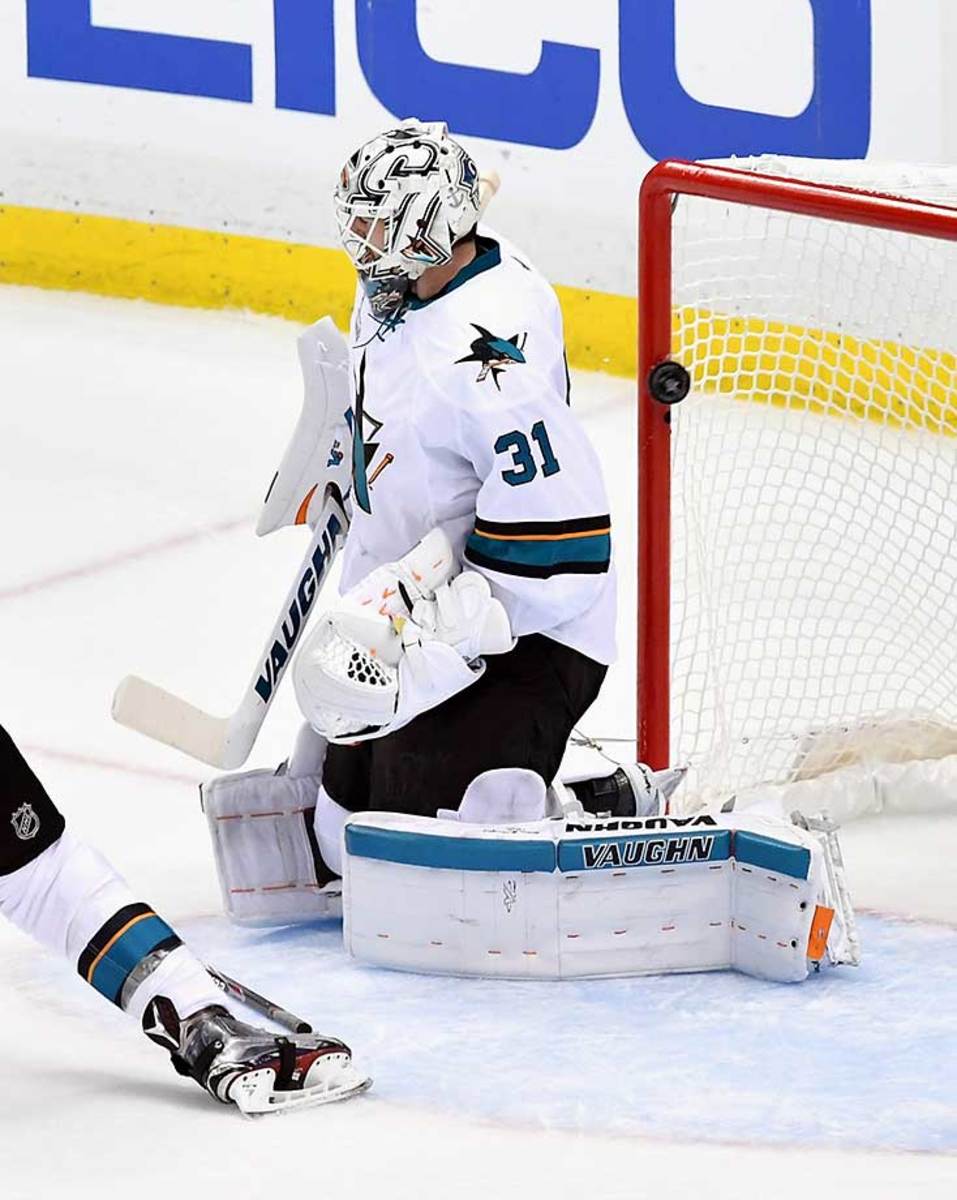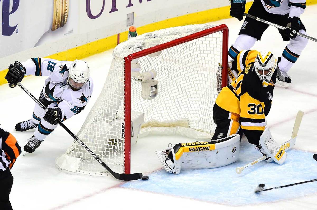 Much the way the Penguins obliged Sullivan’s pregame request, the Sharks emerged from the first intermission looking like the high-flyers who still lead the postseason with 3.42 goals per game. Three minutes in, Tomas Hertl put San Jose on the board with a nifty stuff-in on the power play. Later, forward Patrick Marleau, until Tuesday the owner of the NHL record for most playoff games without a Cup final appearance, caught goalie Matt Murray on a slow post-to-post recovery and wrapped a rebound around to the far side. Jones, meanwhile, was magnificent while facing 41 shots—more than he had seen in any regulation game this postseason—at least until he dropped onto his knees, squared up to Bonino, and watched the winning puck fly over his shoulder.