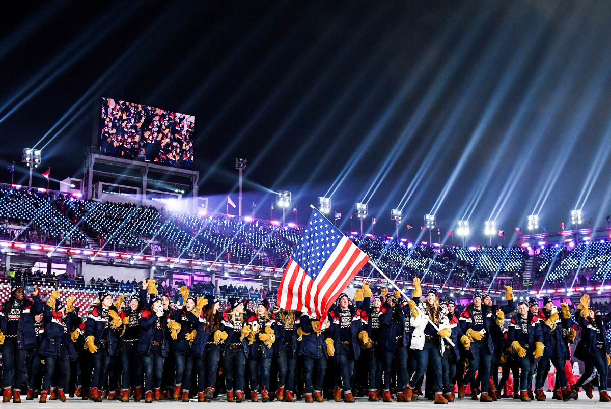Luger Erin Hamlin carries the flag for Team USA.