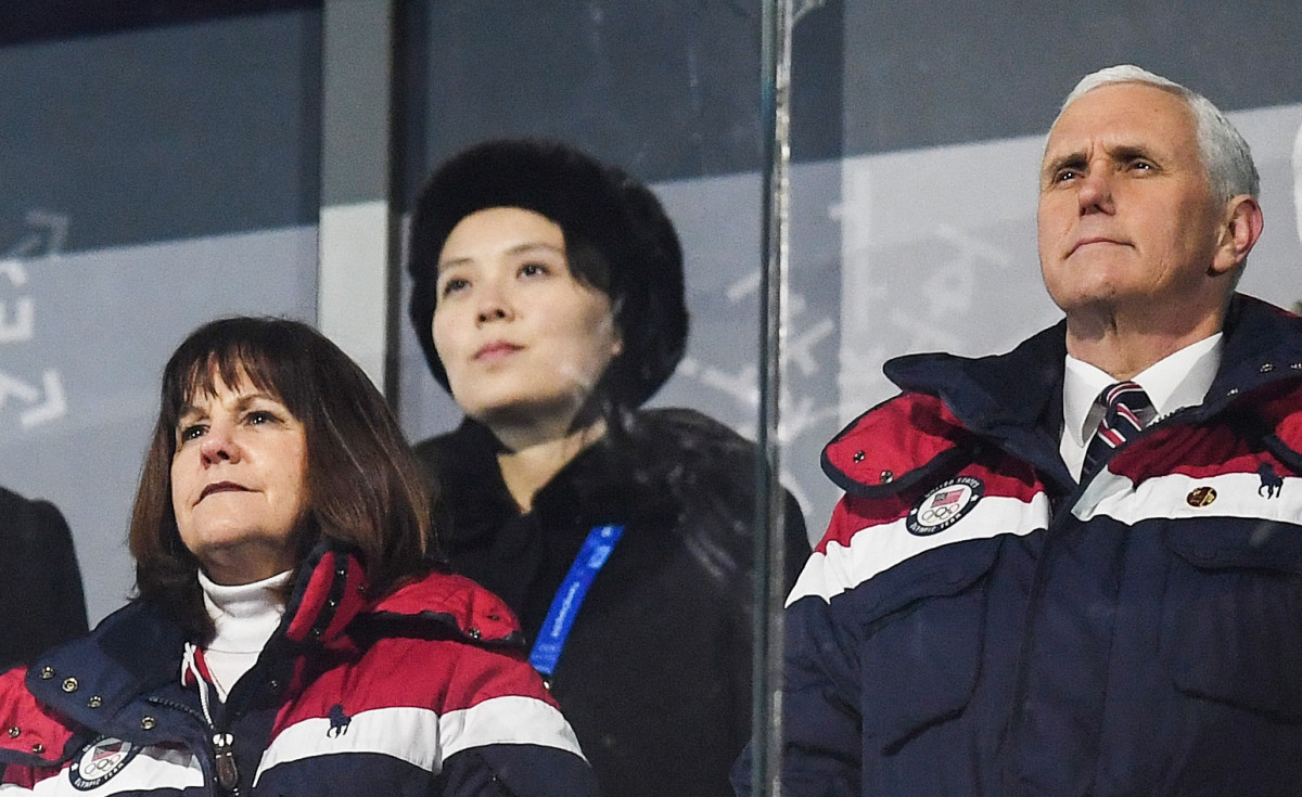 Karen Pence (left); Kim Yo-jong, sister of North Korean leader Kim Jong-un (center); and Vice President of the U.S. Mike Pence watch the Opening Ceremony.