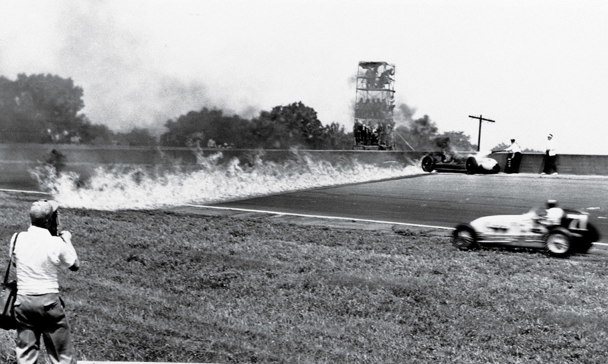 Norm Houser took an infield detour to dodge the trail of fire left by Duke Nalon's crash into the retaining wall. Nalon's injuries knocked him out of racing for two years.