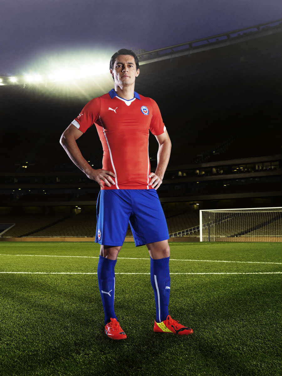 With a collar inspired by classic Chilean uniforms, the home red gets all patriotic when paired with blue shorts and blue and white accents. The Chilean national flag also finds its way on the nape of the shirt. The away kit offers a white base with long, vertical blue stripes and red accents, sticking in the same color spectrum.