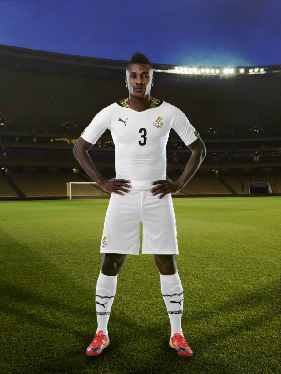 Tonal prints and oh, that collar. The away all-red has a patterned black graphic, similar to Cameroon. The home white doesn’t stay all white, with an oversized collar that features the gold and black of the colorful Black Stars’ national flag. The stars and football field graphic also plays on the sleeves.